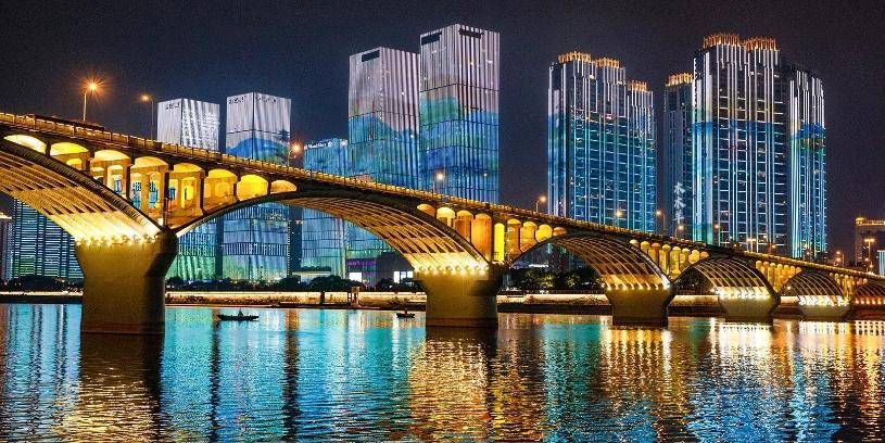临江楼宇外墙以LED光源呈现出一幅幅动态图案,就像以湘江两岸建筑为巨型幕布,投影出一幕幕生动璀璨的影像。灯光颜色还可以依据季节、节日而变化。建筑、桥梁、灯光、江水交相辉映,色彩斑斓。